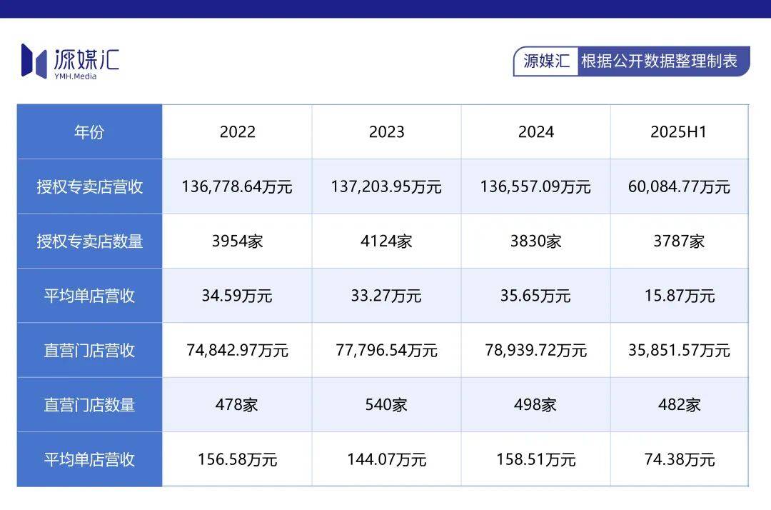 相比之下,直营门店的表现同样不容乐观。2024年直营门店数量从540家降至498家,2025年上半年进一步减少至482家。虽然直营单店营收在2024年回升至158.51万元,但2025年上半年仅为74.38万元。