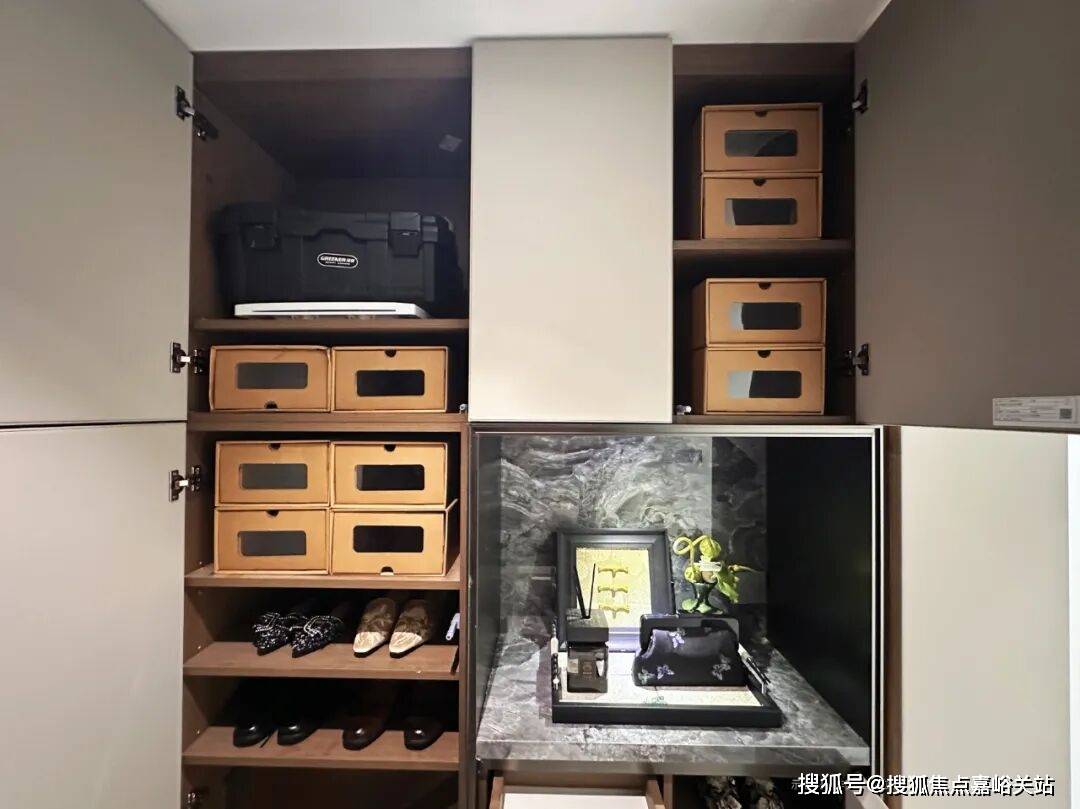 衣柜巧用门后垂直空间,设置大量挂衣区与双面柜体,实现空间翻倍;主卫镜柜分层设计搭配分隔盒收纳护肤品,地柜采用抽屉式设计并内置防水收纳盒,分类存放清洁用品,细节满满。