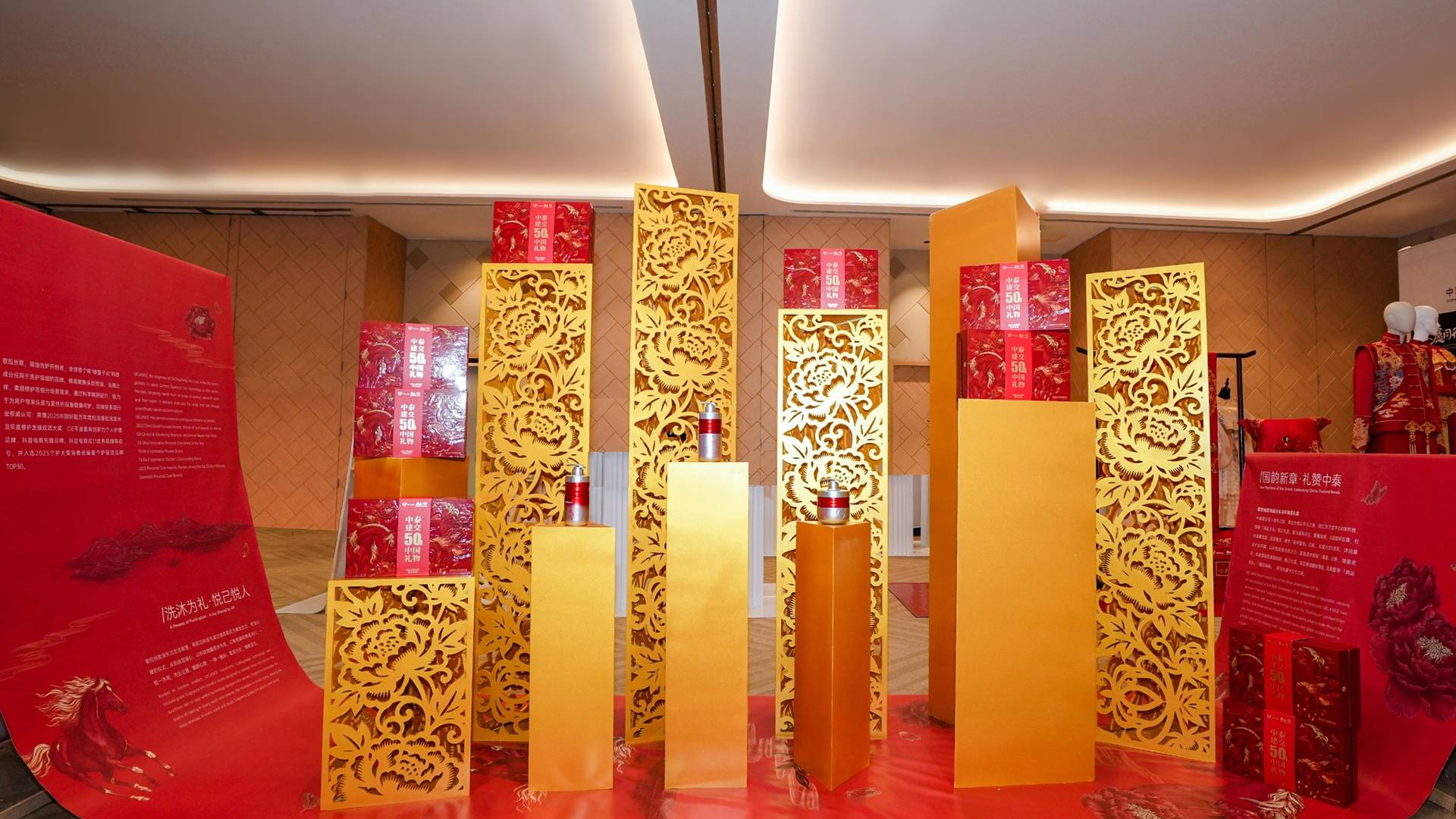 据悉,本次展出的“鸿运当头”礼盒以红金为主色调,将骏马凌风的昂扬气韵与国色牡丹的绽放盛景相融,瓶身题刻“鸿运当头”“馥浴满身”,字字传递新春的美好祝愿。作为“中泰建交50周年中国礼物”,该礼盒承载着中泰两国邦谊永驻、鸿运共承的深厚期许,成为连接两国文化情谊与吉祥寓意的重要载体。