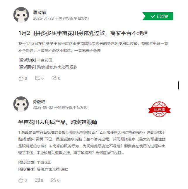 浏览黑猫投诉,截至2026年2月6日,“半亩花田”累计相关投诉74条。数量真心不算多,可质疑主要涉及产品质量、售后服务等敏感问题。