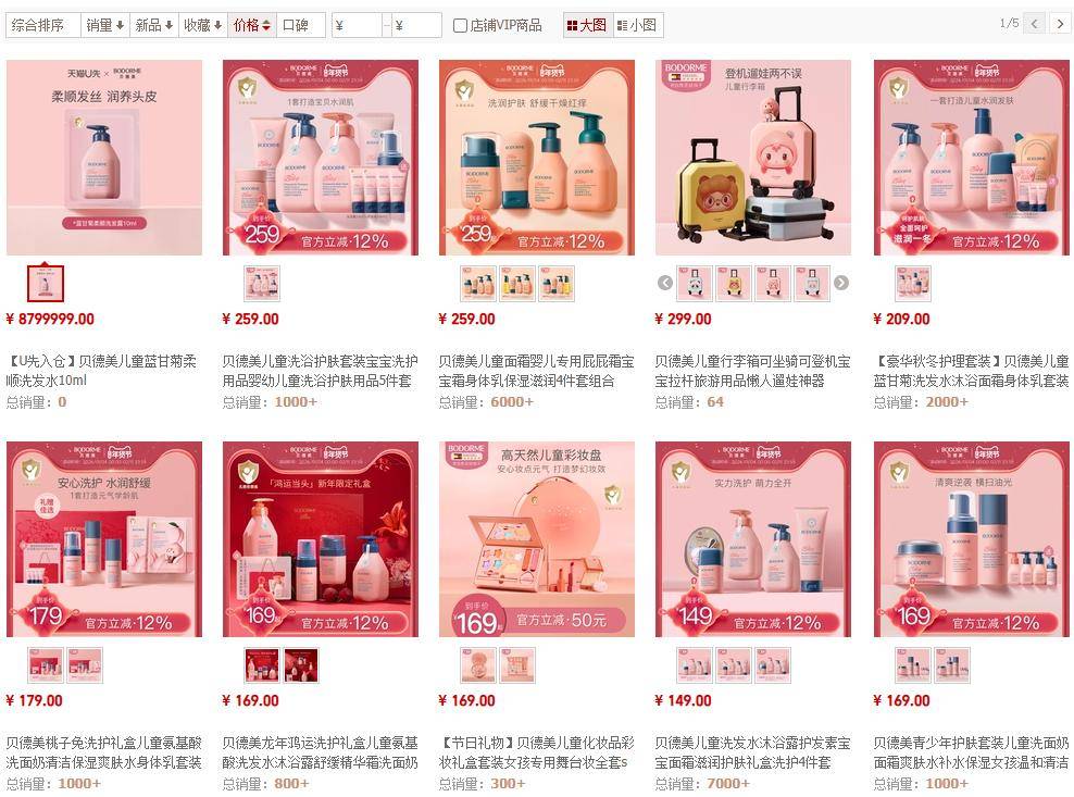 主打产品线定价略高的情况。青少年面霜定价129元/50g,而儿童舒缓保湿霜产品定价为88.7元/50g,两者差距明显。贝德美则采用平价策略抢占市场,即使是5件套组合产品也仅为259元,展现出极高的性价比。