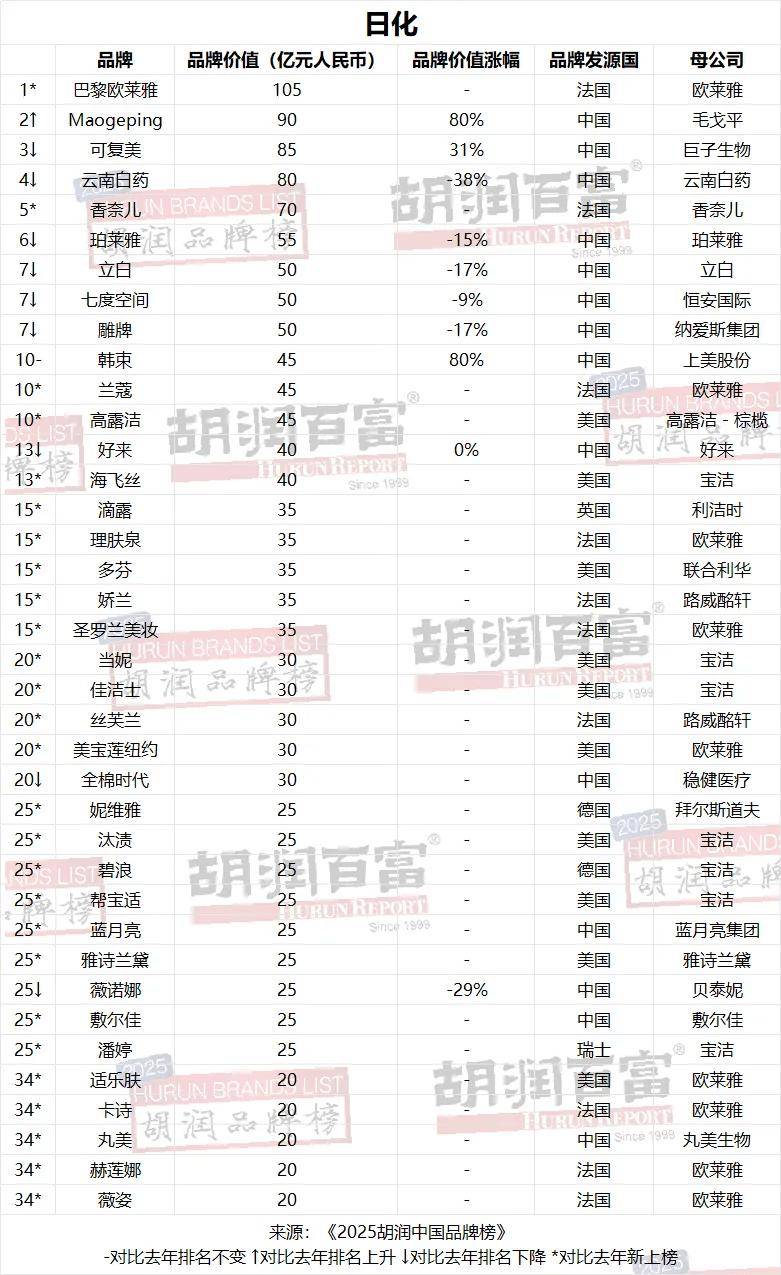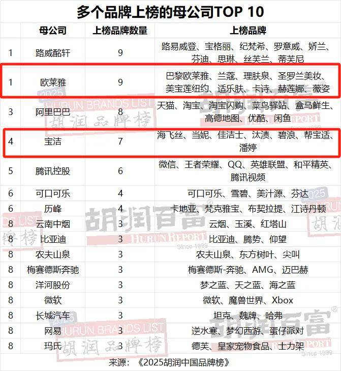 值得注意的是,在众多品牌中,有多家公司旗下多个品牌上榜,日化行业做出了一定贡献。其中,数量最多的是LVMH集团和欧莱雅集团,各有9个品牌上榜;宝洁有7个品牌上榜。”