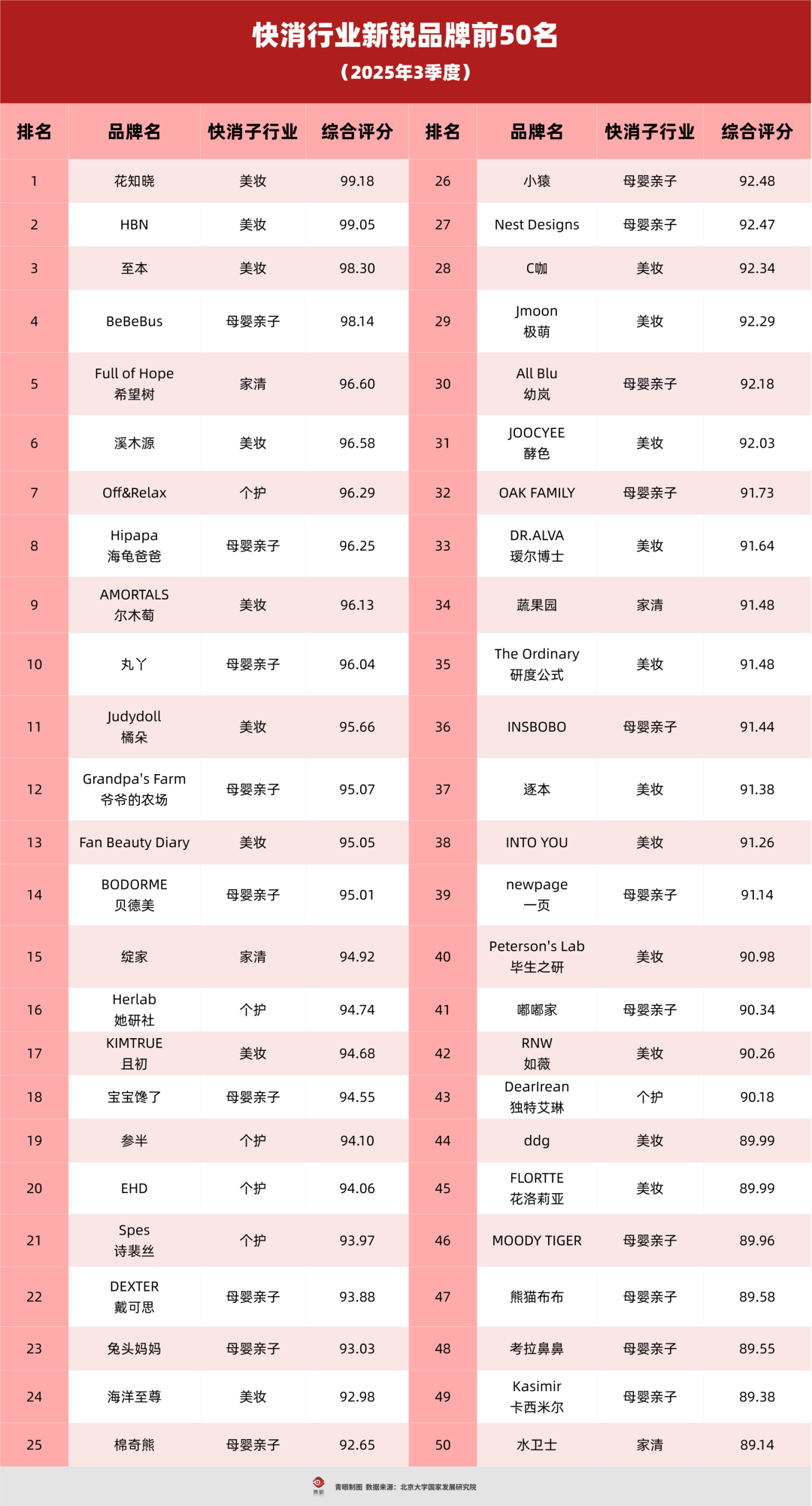 近日,北大国发院这个CBI课题组的2025年第三季度“快消行业新锐品牌榜”正式发布。这是一个更有针对性的研究,榜单基于淘宝天猫数十亿真实交易数据,将品牌搜索量、新锐度、复购情况甚至店铺评分都纳入统计之中,重点观察了快消的美妆、家清、个护、母婴四个子行业,仅统计成立15年以内的品牌,最终呈现出一份更贴近消费者真实需求的新锐品牌价值和赛道排行。
